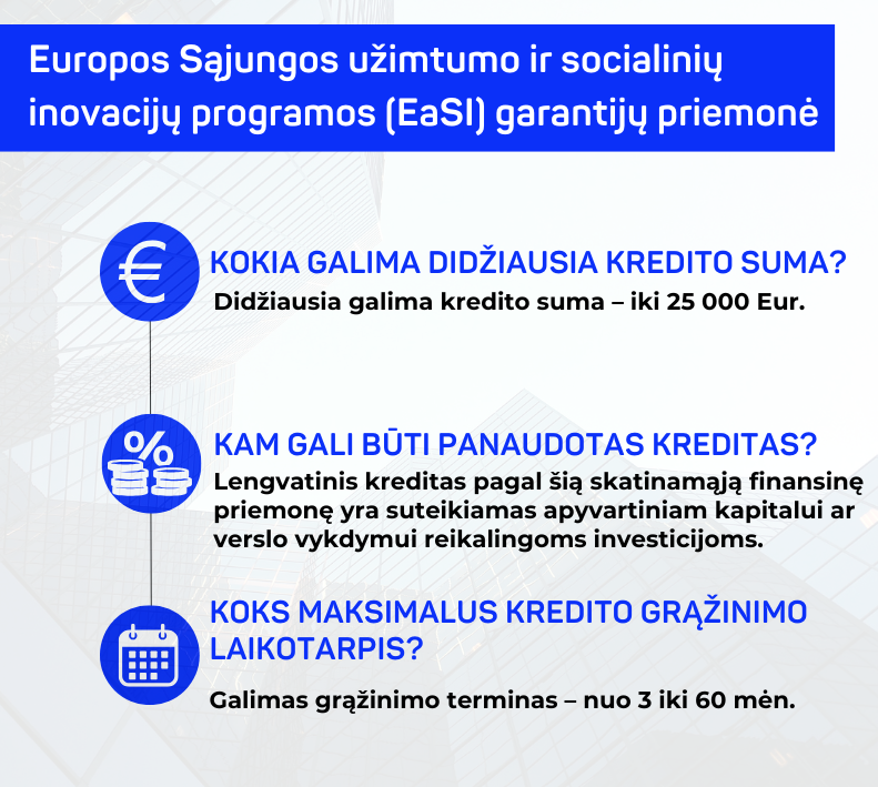 Garantijas teikia Europos investicijų fondas (EIF). EaSI garantijų priemonė yra skirta mikrofinansavimui ir socialiniam verslumui skatinti.