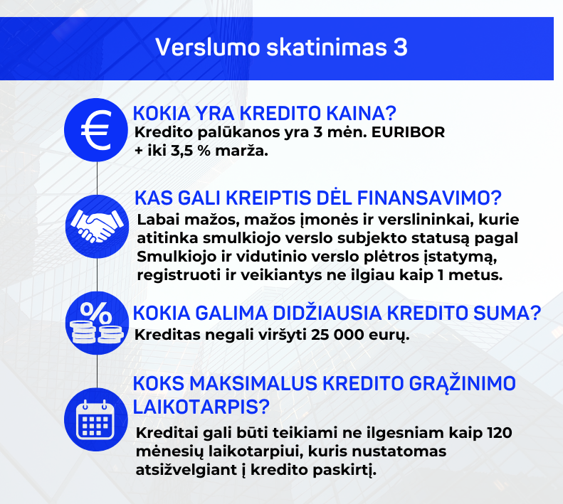 Finansinės priemonės „Verslumo skatinimas 3“ tikslas – paskatinti verslumą ir savarankišką užimtumą, suteikiant palankias finansavimo galimybes jaunam verslui. Ši priemonė orientuota į įmones, kurios yra registruotos ir veikia ne ilgiau kaip vienerius metus. Siūlome investicinius ir (arba) apyvartinius kreditus.